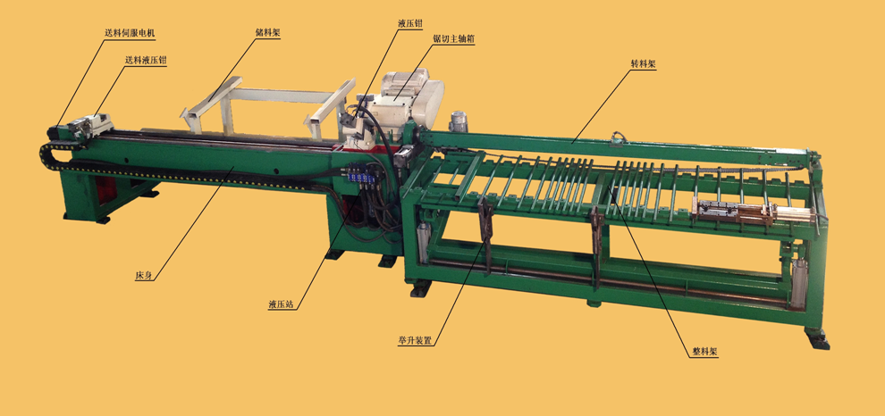 1、送料伺服電機(jī) 2、送料液壓鉗 3、儲料架 4、床身 5、液壓站 6、液壓鉗 7、鋸切主軸箱 8、轉(zhuǎn)料家 9、舉升裝置 10、整料架 11、電控箱