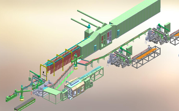8、 自動(dòng)化輥皮涂裝線,采用自動(dòng)噴涂工藝,降低了勞動(dòng)強(qiáng)度,提高了功效,提高了外表美觀度,冷卻時(shí)的熱量又轉(zhuǎn)為采暖及生活用熱水,節(jié)約了能源。輥皮表面噴塑由5自由度機(jī)械手,配合懸掛輸送鏈,完成輥皮的自動(dòng)上下線;懸掛輸送鏈上設(shè)有自?shī)A緊式專用吊具(專利)。